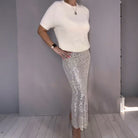 ELEGANTES ZWEITEILER-SET: Kombiniert ein gemütliches Strickoberteil mit einem funkelnden Paillettenrock. Dieses vielseitige Duo wechselt mühelos von entspannten Alltagslooks zu glamourösen Abenden und bietet einen kompletten, schicken Auftritt ganz ohne den Aufwand des Kombinierens einzelner Teile.