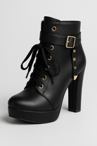 Ellie Stiefeletten vereinen markantes Design und Komfort – perfekt, um Ihrem Alltagslook einen Hauch von Eleganz zu verleihen. Gefertigt aus weichem Material in Lederoptik, verfügen diese Stiefeletten über einen hohen Absatz, der die Silhouette streckt, während elegante Schnürsenkel und eine metallische Schnalle für luxuriöse Akzente sorgen. Der seitliche Reißverschluss ermöglicht ein schnelles und einfaches Anziehen, während die rutschfeste Sohle bei jedem Schritt für Stabilität sorgt. Vielseitig und chic – diese Boots sind ideal für jeden Anlass, vom lässigen Look bis zum eleganten Outfit.