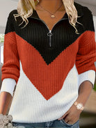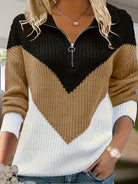 Laura ist ein Pullover mit langen Ärmeln und einer markanten V-Form aus kontrastierenden Farbflächen. Der Ausschnitt ist mit einem halben Reißverschluss versehen, was für ein praktisches und charakteristisches Detail sorgt. Die Farbkombination verleiht dem Pullover eine ruhige, aber dennoch ausdrucksstarke Ausstrahlung. Bund und Ärmelbündchen sind sauber verarbeitet, wodurch der Pullover angenehm zu tragen ist und seine Form schön behält.