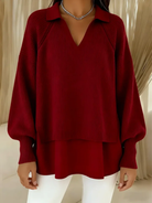 Der Pullover vereint den Tragekomfort von Strickmode mit der edlen Optik einer leichten Bluse. Die obere Lage ist sanft gestrickt und fühlt sich warm und geschmeidig an, während der untere Saum aus einem leichten, fließenden Stoff besteht, der dezent unter dem Pullover hervorschaut. So entsteht ein Lagenlook, ohne dass mehrere Teile getragen werden müssen.