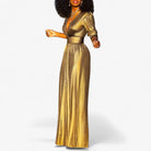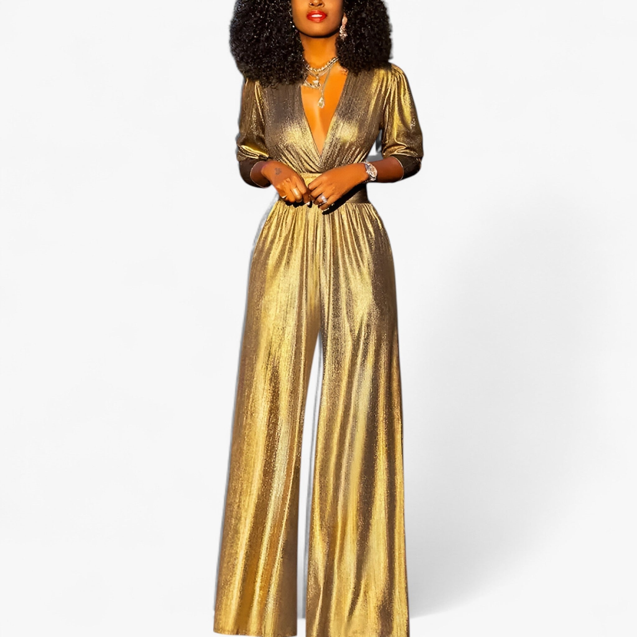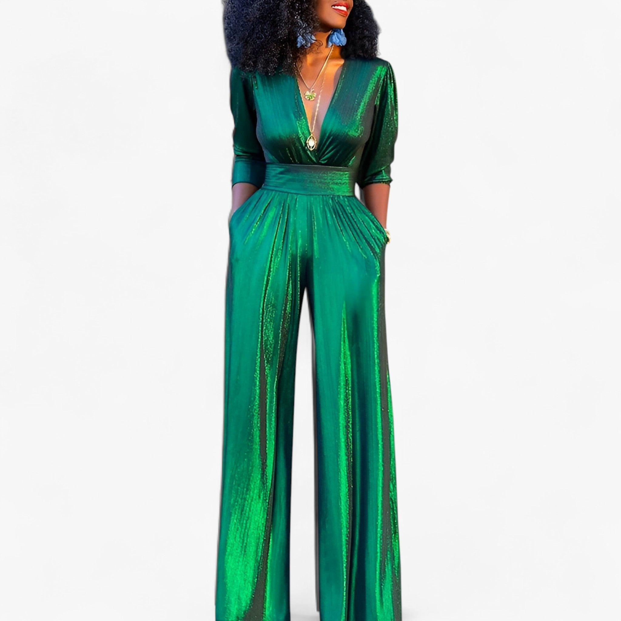 Glänzend und gewagt – dieser metallische Jumpsuit in Smaragd verleiht jedem Anlass sofort einen Hauch von Glamour. Der weite Bein-Schnitt sorgt für eine fließende, gestreckte Silhouette, perfekt für elegante Abende oder festliche Events.